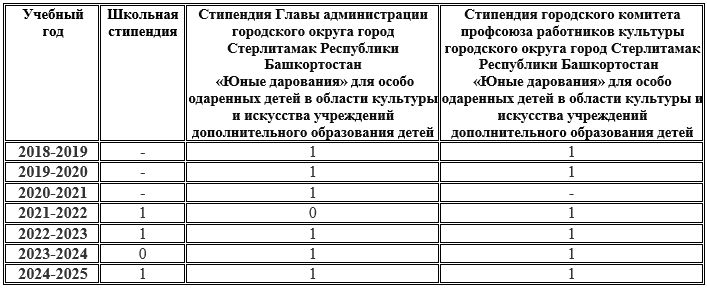 Ежегодно учреждение представляет учащихся, достигнувших значительных творческих успехов в учебе и творческой деятельности, к присуждению/назначению следующих стипендий и премий: